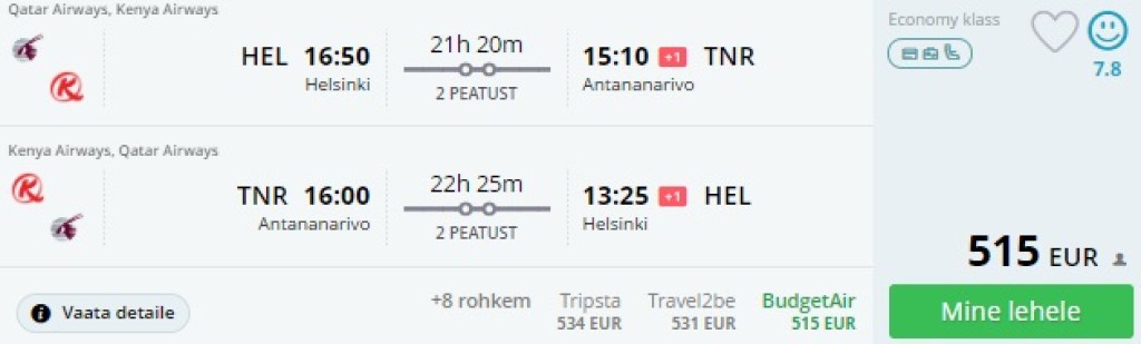 Hetkel on leitavad harukordselt soodsad ja mugavad lennud Madagaskarile. Edasi-tagasi lennupiletid Helsingist Antananarivosse on saadaval alates 515€ eest. Valikus on ohtralt soodsaid lennukuupäevi oktoobri lõpust märtsini (v.a dets). Lennud on mõlemal suunal kahe ümberistumisega (Dohas ja Nairobis). Kõik väljaotsitud näidiskuupäevad on kiirete ümberistumistega ning kellaajad Helsingist väljumistel ning saabumistel on väga soodsad Tallinna ja Helsingi vahel samal päeval reisimiseks!Lennupiletite ostmiseks kliki allpool olevatel näidiskuupäevadel või otsi need ise läbi momondo.