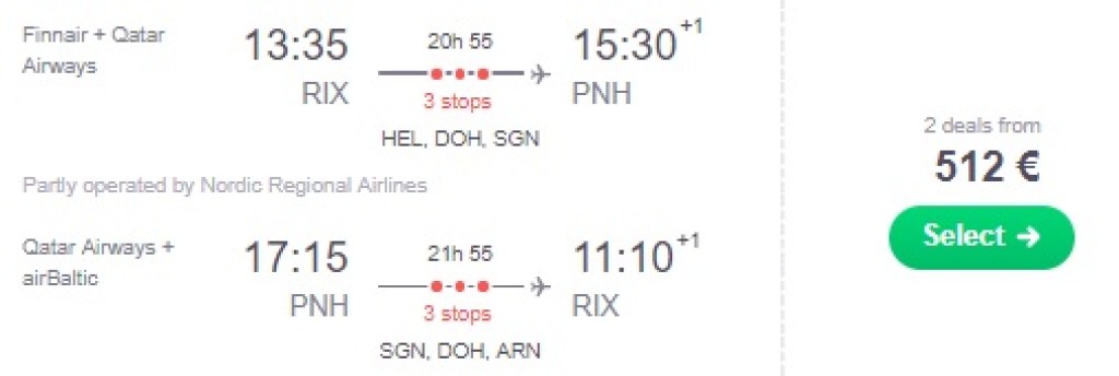 Qatar Airways pakub hetkel hea hinnaga lennupileteid Riiast Kambodžasse. Edasi-tagasi lennupiletid Phnom Penhi on saadaval alates 512€ eest. Hea saadavus sügiseks ja talveks. Piletiteni jõudmiseks kliki allpool olevatel näidiskuupäevadel või kontrolli endale sobivaid lennukuupäevi läbi skyscanneri.
