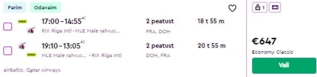 Qatar Airways pakub hetkel väga hea hinnaga lennupileteid Maldiividele. Edasi-tagasi lennupiletid Riiast on saadaval al 647€ eest ning ohtralt hea hinnaga lennupileteid leiab oktoobrist märtsini. Lennupiletite hinnas sisaldub ka äraantav pagas. Lennupiletiteni jõudmiseks kliki allolevatel näidiskuupäevadel või kontrolli endale sobivaid kuupäevi läbi momondo.ee.