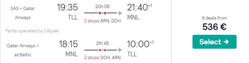 Qatar Airways pakub hetkel hea hinnaga lennupileteid Tallinnast Filipiinidele. Soodsamad edasi-tagasi lennupiletid Manilasse on saadaval al 546€ eest. Valikus on lennukuupäevi novembris-detsembris ning märtsis-aprillis. Piletiteni jõudmiseks kliki allolevatel näidiskuupäevadel või kontrolli endale sobivaid kuupäevi läbi skyscanneri.
