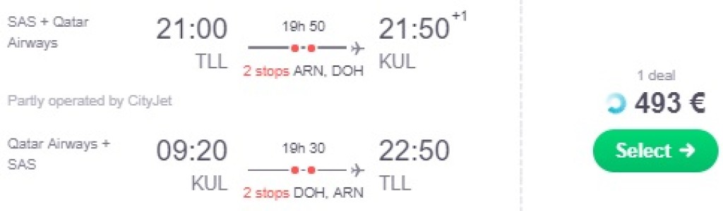 Qatar Airways pakub hea hinnaga lennupileteid Tallinnast Malaisiasse. Edasi-tagasi lennupiletid Kuala Lumpurisse on saadaval 493€ eest ning saadaval on ohtralt lennukuupäevi augustist märtsi lõpuni. Piletiteni jõudmiseks kliki allolevatel näidiskuupäevadel või kontrolli endale sobivaid kuupäevi läbi skyscanneri