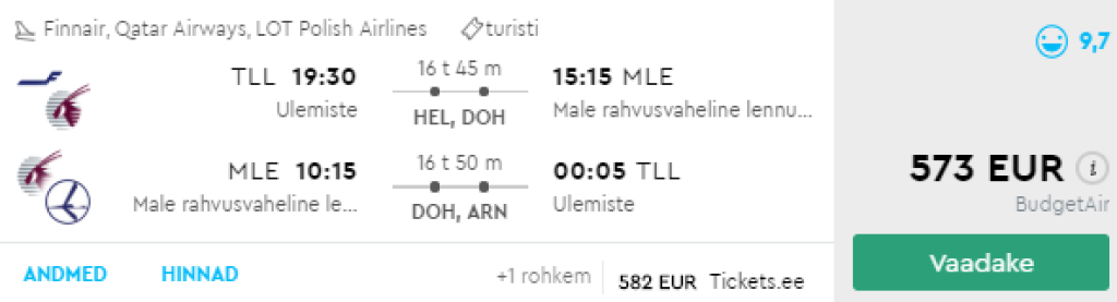 Qatar Airways pakub hetkel hea hinnaga lennupileteid Maldiividele. Edasi-tagasi lennupiletid Tallinnast Malesse on saadaval alates 573€ eest. Soodsa hinnaga lennupileteid leiab kogu sügiseks ja talveks (v.a detsember). Lendudel on mõlemal suunal kaks mugavat ümberistumist ning lennupiletite hinna sees on ka äraantav pagas. Parima hinnaga lennupiletid leiad üles läbi Momondo.ee