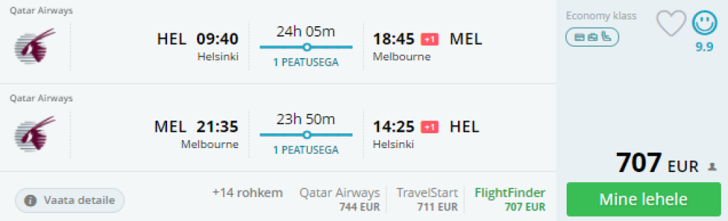 Hetkel on leitavad hea hinnaga lennupileteid Qatar Airwaysiga Helsingist Austraaliasse. Edasi-tagasi lennupiletid on saadaval alates 706€ eest. Saadaval valik soodsaid lennukuupäevi Perthi, Adelaidesse või Melbourne'i veebruari lõpust juunini. NB: võimalikud ka erinevad open- jaw variandid.