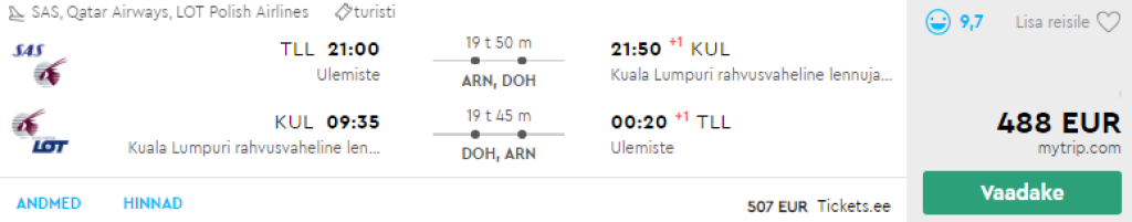 Qatar Airways pakub hetkel väga hea hinnaga lennupileteid Tallinnast Malaisiasse. Edasi-tagasi lennupiletid Kuala Lumpurisse on saadaval 488€ eest ning saadaval on ohtralt lennukuupäevi augustist aprillini. Piletiteni jõudmiseks kliki allolevatel näidiskuupäevadel või kontrolli endale sobivaid kuupäevi läbi momondo.ee