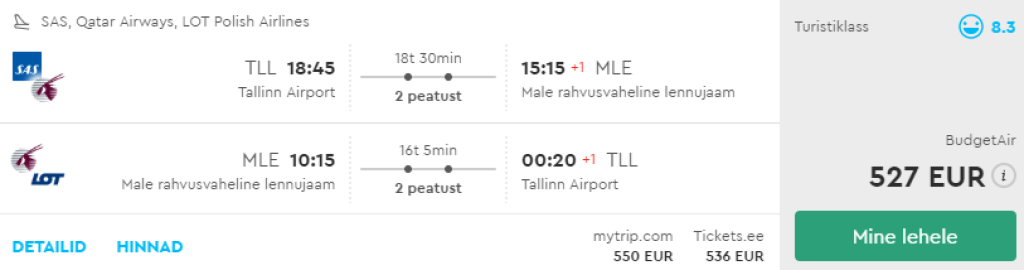 Maailma parim lennufirma Qatar Airways koostöös LOTi ning SASiga pakuvad hetkel väga hea hinnaga lennupileteid Tallinnast Maldiividele. Edasi-tagasi lennupiletid Tallinnast Maldiivide pealinna Malesse on saadaval alates 527€ eest ning lendudel on kaks ümberistumist.