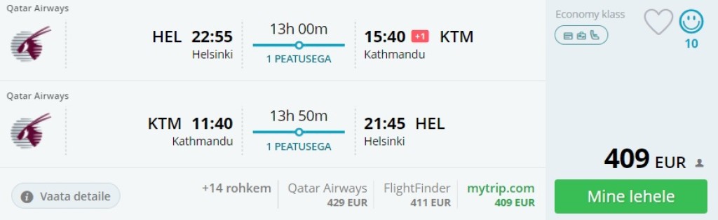 5* lennufirma Qatar Airways pakub lennupileteid Tallinnast Katmandusse hinnaga alates 459€ ja Helsingist hinnaga alates 509€. Saadavus on märgatavalt parem lendudele algusega Tallinnast, kuid talvises lennuplaanis võib Helsingist leida tõeliselt kiireid lennuvariante mõlemas suunas.Lennud Tallinnast Katmandusse toimuvad kas Helsingi ja Doha või Stockholmi ja Doha kaudu. Soodsaid pileteid leiab 2018. a. suveni välja. ReisikindlustusSõlmi reisikindlustus PZU e-poes ja saad 300 euro väärtuses **pagasikindlustuse lisakaitse tasuta kaasa! ** Loe kampaania tingimuste kohta siit.