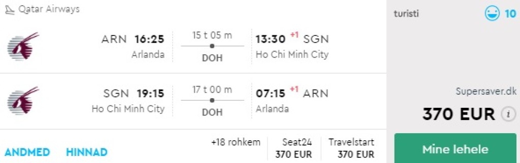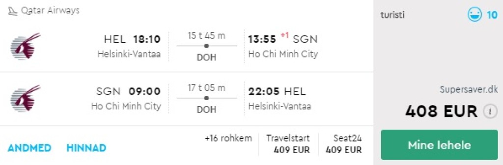 Qatar Airways pakub hetkel väga soodsaid lennuvõimalusi Vietnamisse! Edasi-tagasi lennupiletid Helsingist Ho Chi Minh Citysse on saadaval al 408€ eest, Stockholmist alates 370€ eest. Saadaval on suurepärane valik lennukuupäevi augusti lõpust kuni märtsi lõpuni. Kõik väljaotsitud näidiskuupäevad on ühe mugava ümberistumisega Dohas mõlemal suunal! Tutvu näidiskuupäevadega allpool või kontrolli endale sobivaid läbi momondo.