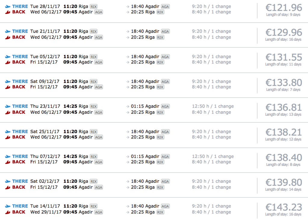 Puhka Maroko ühes kuulsaimas rannakuurortis Agadiris! Hetkel on võimalik leida edasi-tagasi lennupileteid Riiast Agadiri hinnaga alates 122€. Soodsad lennupiletid on saadaval novembris ja detsembris. Novembris võivad päevased temperatuurid Agadiris kerkida isegi 30 kraadi ringi. Lennupiletid on saadaval erinevate odavlennufirmadega, ning otsisime tripikate jaoks välja kiired lennud, kus ümberistumiste aeg lennujaamades jääb 2h ning 4h vahele.