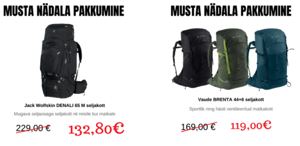 Nimelt on käimas Matkaspordil nende suur Musta nädala kampaania, mille raames leiab suurepärase hinnaga seljakotte, matkavarustust ja palju muud. Soodsa hinnaga tooted on saadaval soetamiseks kuni 28.11.