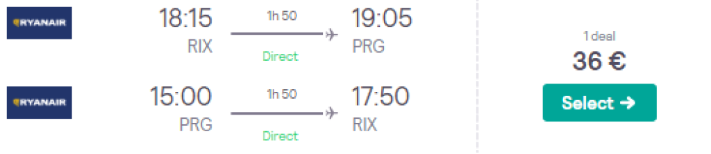 Odavlennufirma Ryanair pakub hetkel väga hea hinnaga lennupileteid otselendudele Riiast Prahasse. Edasi-tagasi lennupiletid on saadaval alates 36€ eest ning hea hinnaga lennupileteid leiab novembrist veebruarini. Ryanairi lennud Riia ja Praha vahel toimuvad 3x nädalas - teisipäeviti, neljapäeviti ja laupäeviti. Soodsate lennupiletiteni jõudmiseks kliki allolevatel lennukuupäevadel või kontrolli endale sobivaid läbi skyscanneri