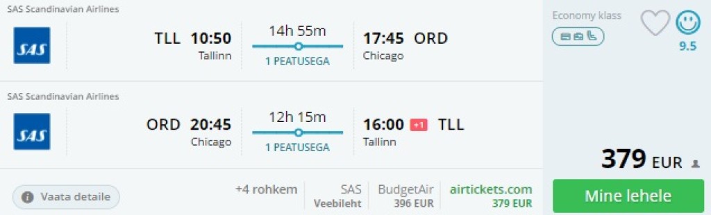SAS pakub hetkel väga hea hinnaga lennupileteid Tallinnast Chicagosse. Edasi-tagasi lennupiletid on saadaval alates 379€ eest. Saadavust märtsist maini. Soodsate lennupiletite ülesleidmiseks kasuta otselinke allpool või kontrolli endale sobivaid lennukuupäevi läbi momondo.