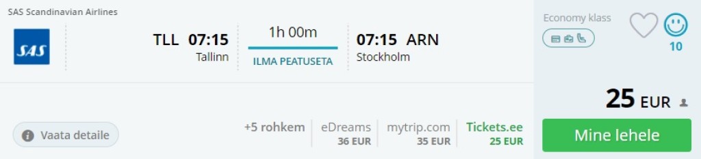 SAS pakub otselende Tallinnast Stockholmi algusega 25€ üks suund, edasi-tagasi alates 66€. Kõige soodsamaid lende on saada ainult jaanuari ühel nädalal, veidi kallimaid 76€ maksvaid pileteid jaanuaris ja veebruaris.
