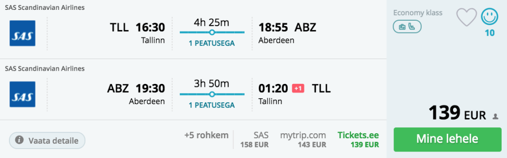 SAS pakub soodsaid lennupileteid kevadeks ja suveks Tallinnast Šotimaale, Aberdeeni või Edinburghi. Kiirete ümberistumistega edasi- tagasi lennupileteid leidub al 124€ eest. Piletiteni jõudmiseks kliki otselinkidel allpool või sisesta endale sobivad lennukuupäevad Momondosse. Tutvu kindlasti ka erinevate "open-jaw" variantidega pakkumise lõpus.