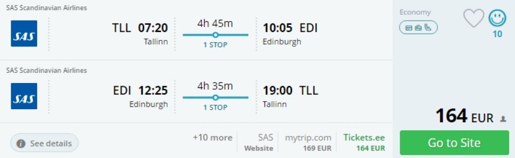 SAS pakub aprillist juunini lennupileteid Tallinnast Šotimaale Edinburghi hinnaga 164€ - 166€. Lendudel on üks kiire ümberistumine Stockholmis.