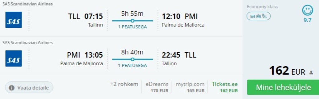 SAS pakub novembri alguses pileteid Tallinnast Mallorcasse hinnaga 162€. Lennud on ühe ümberistumisega Stockholmis.