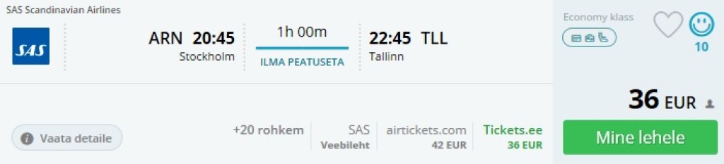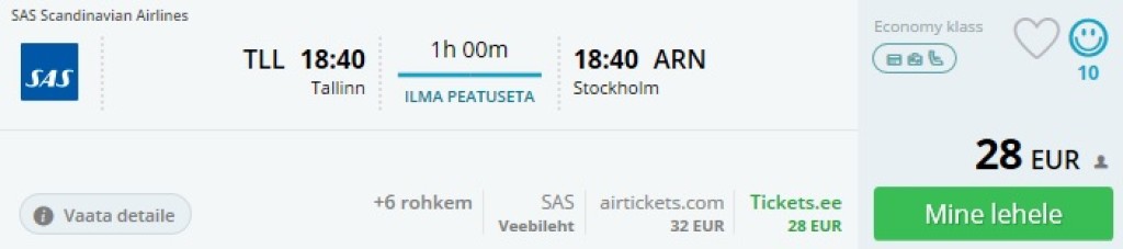 SAS pakub otselende Tallinnast Stockholmi algusega 28€ üks suund, edasi-tagasi 73€. Saadavust on alates jaanuarist kuni veebruari lõpuni. Edasi-tagasi lennu saab ka soodsamalt, kui valida kaks ühe suuna piletit 28€ (TLL-ARN) ja 36€ (ARN-TLL), kokku 64€. See on siiski pigem teoreetiline variant, sest kahe makse puhul lisandub maksekaardi tasu 2 korda. Veidi suurema seltskonnaga reisides ja koos ostes tasub see jällegi kaalumist.