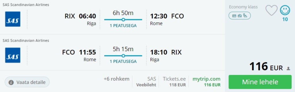 SAS-iga leiab veebruaris ja märtsi alguses üsnagi häid hindu lendudele Rooma algusega nii Tallinnast kui Riiast. Lennud Riiast on veidi soodsamad ja enamasti mugavamate ümberistumistega (mõlemal juhul Kopenhaagenis). Kuupäevavalik on kaunikesti piiratud. ReisikindlustusSõlmi reisikindlustus PZU e-poes ja saad 300 euro väärtuses **pagasikindlustuse lisakaitse tasuta kaasa! ** Loe kampaania tingimuste kohta siit.