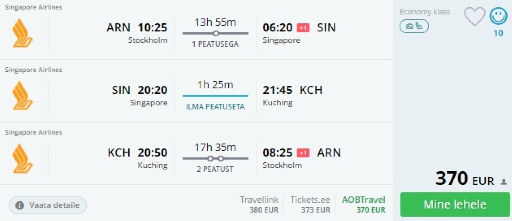 Singapore Airlines pakub hetkel väga hea hinnaga lennupileteid Stockholmist Borneole, Kuchingi. Edasi-tagasi lennupiletid on saadaval alates 340€ eest. Saadaval soodsaid lennukuupäevi aprillis- mais. Soovi korral on võimalik teha ka paaripäevane peatus Singapuris (vt näidet allpool).