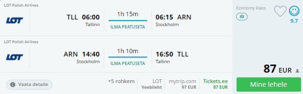Stockholmi saamiseks on parim variant kasutada Nordica otselende, lennuajad klapivad väga ilusti ning hinnas sisaldub ka äraantav pagas. Edasi- tagasi lennupiletid Tallinnast Stockholmi saad kätte al** 87€** eest.