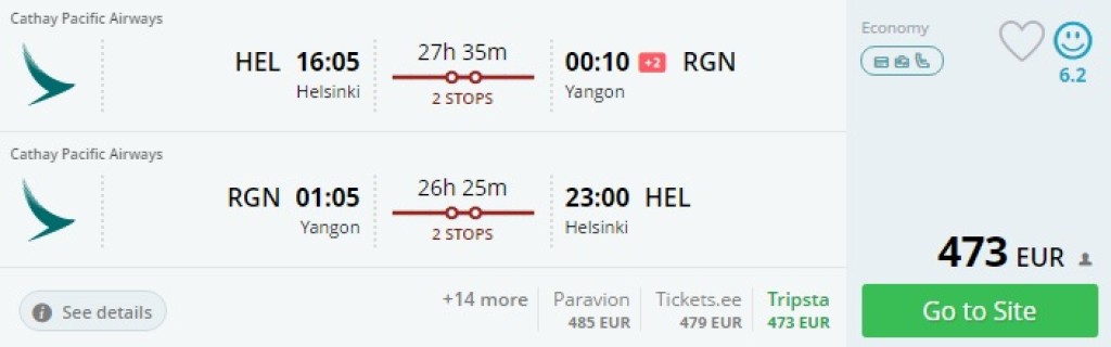 Cathay Pacific pakub soodsaid lennupileteid Stockholmist ja Helsingist Myanmari suurimasse linna Yangoni (endise nimega Rangoon). Hinnad Stockholmist algavad 383€, Helsingist 473€. Lennud toimuvad Cathay Pacificu sihtkohtade kaudu Euroopas ja üle Hongkongi. Vahepeatuse pikkust Hongkongis saab valida. Kiiremate ümberistumistega lennud on vaid mõned eurod kallimad. Tulenevalt lennuaegadest on tagasilennul Stockholmi puhul ööbimine vältimatu. Saadaval on ka lennuvariant Stockholm – Yangon – Helsingi.