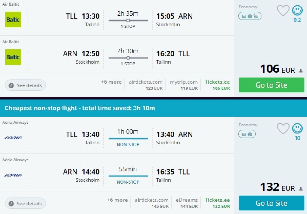 Tallinnast Stockholmi saab sobivatel kellaaegadel kas airBalticuga 106€ (hinnas ainult käsipagas) või Adria Airwaysi veidi kallimate otselendudega, kus käsipagas on hinna sees.