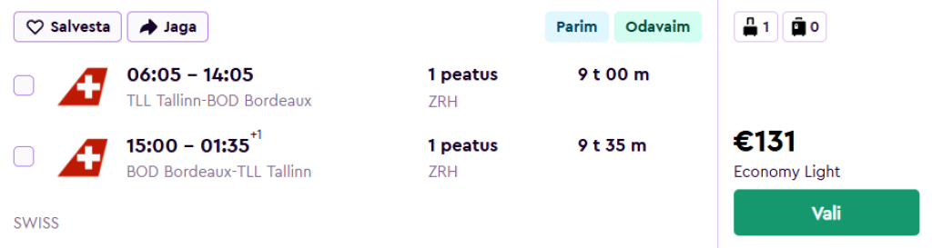Lufthansa koostöös SWISSiga pakuvad hetkel väga hea hinnaga lennupileteid Prantsusmaale. Edasi-tagasi lennupiletid Tallinnast Bordeaux´sse on saadaval alates 131€ eest.