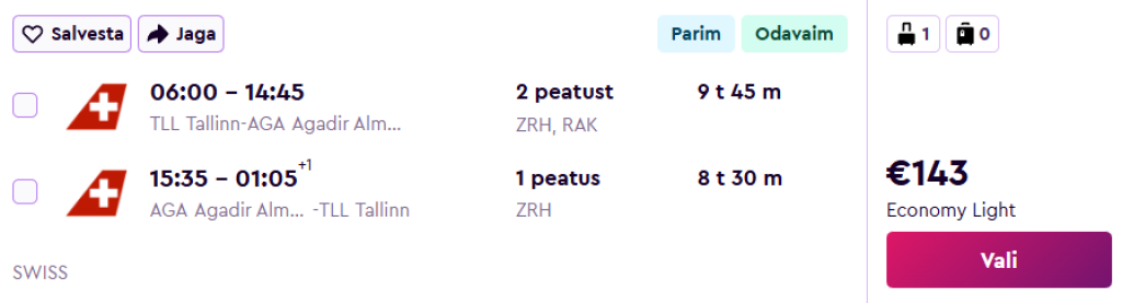 SWISS pakub hetkel suurepärase hinnaga lennupileteid Atlandi ookeani äärsesse Marokosse. Edasi-tagasi lennupiletid Tallinnast Agadiri on saadaval alates 143€ eest.