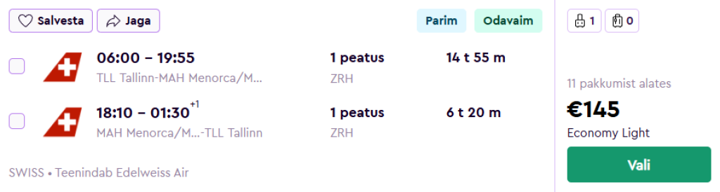 SWISS pakub hetkel suurepärase hinnaga lennupileteid kõrghooajal Hispaaniasse, Vahemere saarele. Edasi-tagasi lennupiletid Tallinnast Menorcale on saadaval alates 145€ eest.