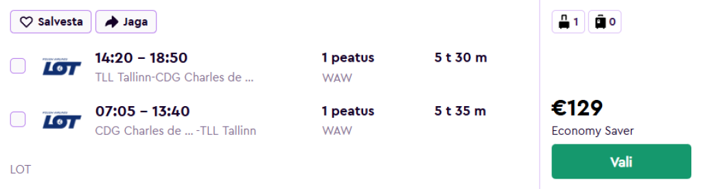 LOT pakub käimasoleva kampaania raames suurepärase hinnaga lennupileteid Prantsusmaale. Edasi-tagasi lennupiletid Tallinnast Pariisi Charles de Gaulle'i lennujaama on saadaval alates 129€ eest.
