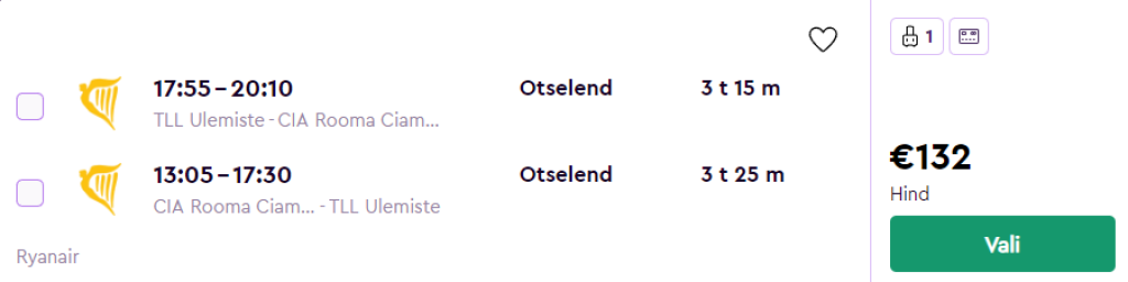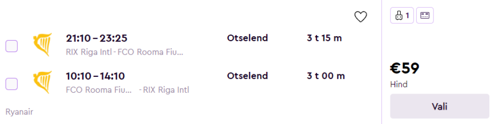 Ryanair pakub hetkel suurepärase hinnaga lennupileteid Itaaliasse. Edasi-tagasi lennupiletid otselendudele Tallinnast ja Riiast Roomasse on saadaval alates 59€ eest. Soodsa hinnaga lennupileteid leiab reisimiseks septembrist kuni detsembrini, sealhulgas ka aastavahetus. Piletiteni jõudmiseks kliki allpool olevatel näidiskuupäevadel või otsi endale sobivaid lennupileteid läbi Momondo.ee