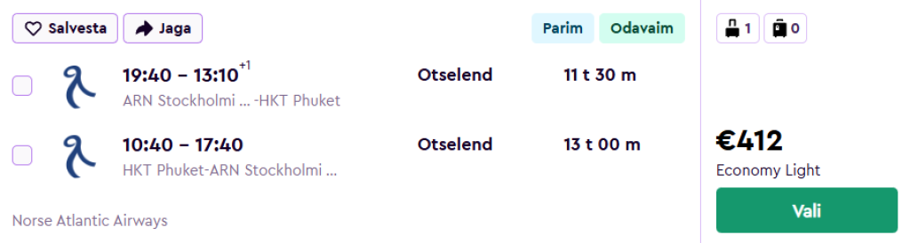 Norse Atlantic Airways pakub hetkel suurepärase hinnaga lennupileteid Taisse. Edasi-tagasi otselennud Stockholmist ja Oslost Phuketi saarele on saadaval alates 412€ eest.