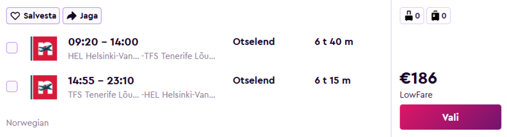 Norwegian pakub hetkel väga hea hinnaga lennupileteid Kanaaridele. Edasi-tagasi mugavad otselennud Helsingist Tenerifele on saadaval alates 186€ eest.