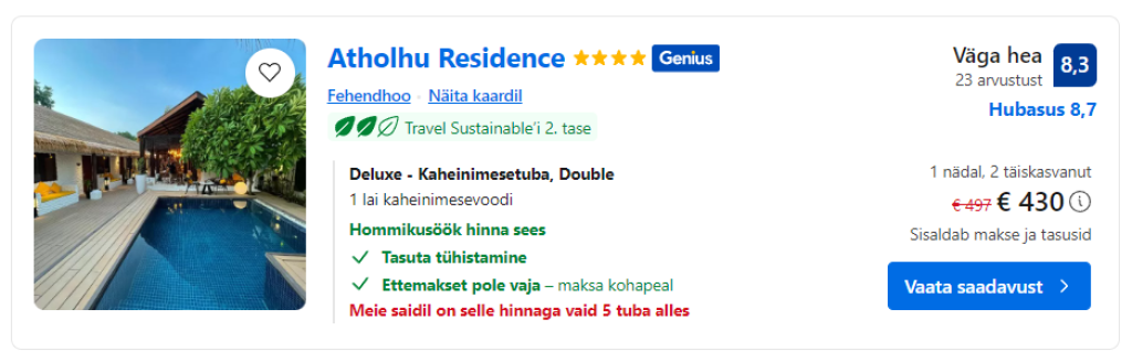 NB! Bookingus kehtivad väga paljudele majutustele Genius-soodustused. Loo kasutaja ning saa osa lojaalsusprogrammi soodustustest.