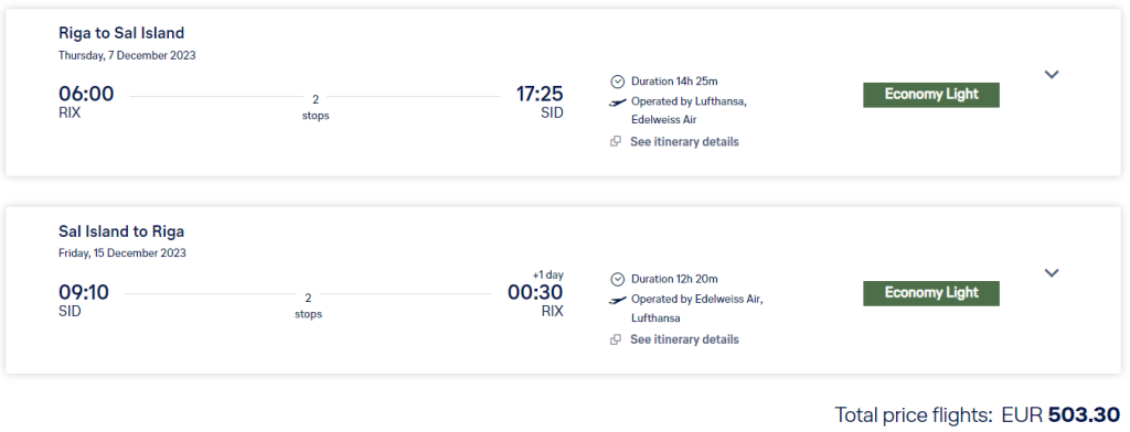 Lufthansa pakub hetkel suurepärase hinnaga lennupileteid Atlandi ookeanis asuvale Cabo Verdele, tuntud ka kui Roheneemesaartele. Edasi-tagasi lennupiletid Riiast Sali saarele on saadaval alates 504€ eest. Lennud on kahe kiire ümberistumisega ning hea saadavus on novembrist kuni märtsini 2024. Parima hinnaga lennupiletid leiab läbi Momondo.ee või meie soovitame osta lennupiletid otse lennufirma Lufthansa.com kodulehelt.