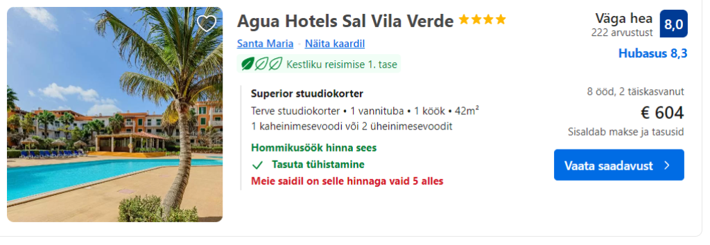 Kui otsid soodsa hinnaga majutust Salil või mujal Roheneemesaarestikus, siis soovitame parima ülevaate ja hinna saamiseks kasutada majutushindade võrdlusportaali Booking.com