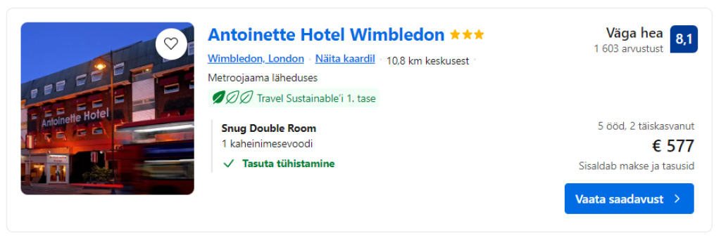 Tasuta tühistamisvõimalusega tuba kahele selles Wimbledoni rajoonis asuvas hotellis maksab 5 ööks kokku 577€ ehk 289€/per person. Lisainfo ja broneerimine.
