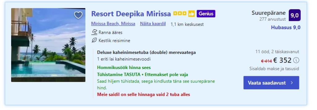 Kui otsid soodsa hinnaga majutust Sri Lankal, siis soovitame parima ülevaate ja hinna saamiseks kasutada majutushindade võrdlusportaali Booking.com
