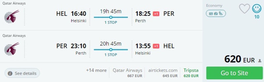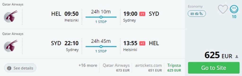 5* lennufirmal Qatar Airways on hetkel märkimisväärselt soodsad hinnad lendudele Helsingist Austraaliasse. Seda juhtub küllalt harva, et edasi-tagasi lennupiletite hind Euroopast Austraaliasse algab numbriga 5 ja see polegi 4-kohaline number. Saadaval on kõik Qatar Airwaysi sihtkohad Austraalias: Sydney, Melbourne, Adelaide ja Perth. Kuupäevavalik on küllalt hea, kuid lennuperiood on piiratud. Väljalend Helsingist peab olema alates oktoobri lõpust ja tagasilend hiljemalt detsembri keskel. Enamikel juhtudel on lendudel kiired ümberistumised ehk vahemaandumised Dohas on alla 3 h.