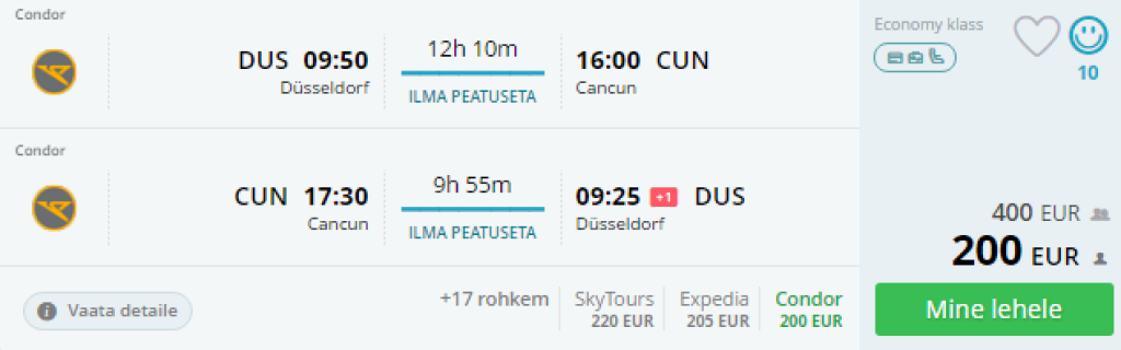 Condor pakub hetkel väga hea hinnaga lennupileteid novembris- detsembris Düsseldorfist Cancuni. Edasi-tagasi lennupiletid on saadaval vaid alates 200€ eest ning tegemist on otselendudega. Soodsad piletid leiad üles läbi allolevate otselinkide või koontrolli endale sobivaid lennukuupäevi läbi Momondo. Sinna juurde võid soetada edasi, tagasi lennupiletid Tallinnast Düsseldorfi, mille hinnad algavad 150 eurost.NB: lennupiletite hinnas ei sisaldu äraantav pagas!
