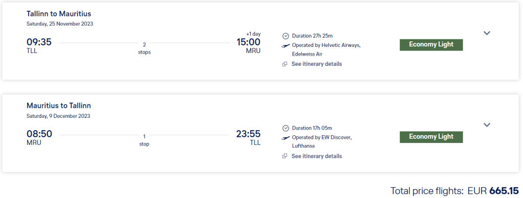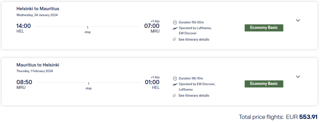 Lufthansa koostöös SWISSiga pakuvad hetkel suurepärase hinnaga lennupileteid India ookeanis asuvale Mauritiuse saarele. Edasi-tagasi lennupiletid algusega Helsingist on saadaval alates 554€ eest ning algusega Tallinnast alates 665€ eest. Helsingist algavate lendude hinna sees on ka 23kg äraantav pagas. Lennud on ühe või kahe ümberistumisega ning mõndadel lendudel on pikem päevane ümberistumine Zürichis või Frankfurdis. Soodsa hinnaga lennupileteid leiab hea kuupäevavalikuga alates septembrist kuni märtsini 2024. Parima hinnaga lennupiletid leiab üles otse Lufthansa.com kodulehelt.