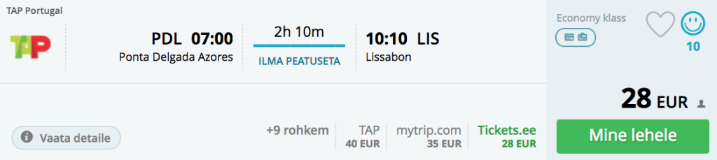 **Funchal-Ponta Delgada(Assoorid) 34€**Soodsaid variante Madeira ning Assooride vahel leidub ohtralt. Otsi piletid endale sobivatel kuupäevadel läbi [Momondo](http://tc.tradetracker.net/?c=18704&m=12&a=292481&u=https%3A%2F%2Fwww.momondo.ee%2Fflightsearch%2F%3FSearch%3Dtrue%26TripType%3D1%26SegNo%3D1%26SO0%3DFNC%26SD0%3DPDL%26SDP0%3D16-05-2018%26AD%3D1%26TK%3DECO%26DO%3Dfalse%26NA%3Dfalse%26currency%3DEUR)**Ponta Delgada-Lissabon al. 28€**Lissabon-Tallinn alates 80€