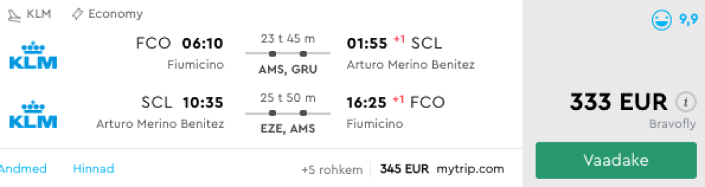 Leidsime väga hea hinnaga lennupiletid Tšiilisse. Soodsaimad edasi-tagasi lennupiletid on saadaval alates 333€ eest ning alla 400€ lennupileteid leiab novembrist kuni märtsini. Kuna üldjuhul on kiiremate ümberistumistega lennupiletid Roomast varahommikul, siis on mõistlikum Rooma päev varem kohale minna ning kuna lend jõuab tagasi Rooma õhtul, siis on soovitatav jääda ka tagasiteel Rooma ööbima. Tegemist on väga hea ajaga külastamaks Tšiilit, kuna lõunapoolkeral on just meie jaoks talvisel ajal suvi. Parima hinnaga lennupiletid leiad üles läbi Momondo.ee