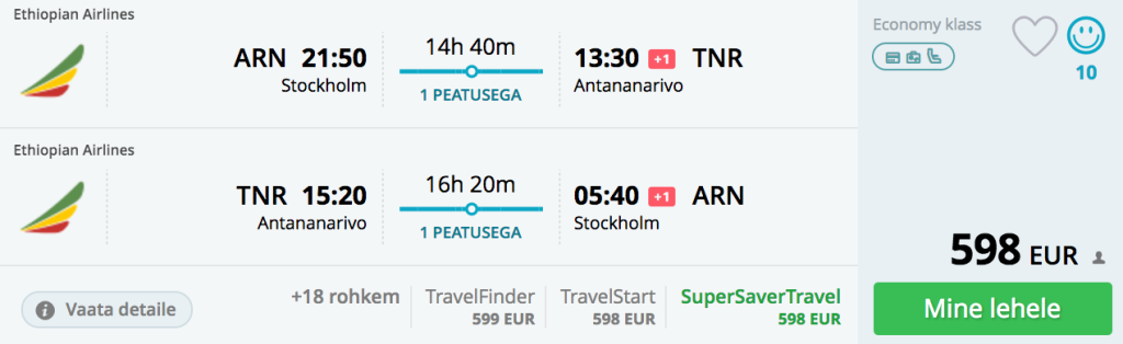 Ethiopian Airlines pakub hetkel väga hea hinnaga lennupileteid Stockholmist Madagaskari pealinna Antananarivosse! Edasi-tagasi lennupiletite hinnad on saadaval oktoobrist kuni juunini hinnaga 598€. Kombineerides need lendudega Tallinnast, saab edasi-tagasi lennupiletid Tallinast Madagaskari saarele kätte vaid 671€ eest!