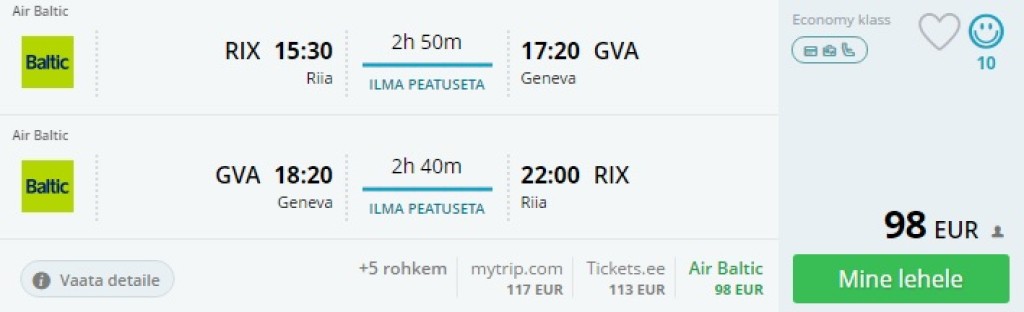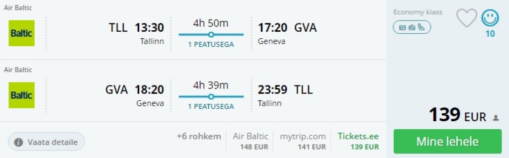 AirBaltic pakub talvel lennupileteid Tallinnast Šveitsi lõunaosas asuvasse Genfi, kust saab minna nii Šveitsi, Prantsusmaa kui Itaalia Alpides asuvatesse suusakuurortitesse. Lennud Genfi toimuvad 3x nädalas, teisipäeval, neljapäeval ja laupäeval. Lennud on ühe kiire ümberistumisega Riias. Soodsamad väljumised on teisipäeval ja neljapäeval, tagasilennuks sobib ka laupäev.
