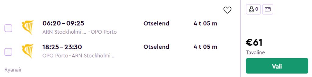 Ryanair ja Eurowings pakuvad hetkel suurepärase hinnaga lennupileteid Portugali. Edasi-tagasi lennupiletid Stockholmist Portosse ja Farosse on saadaval alates 61€ eest. Soodsa hinnaga otselende leiab suviseks reisiks, augustis ja septembris. Lennupiletiteni jõudmiseks kliki allolevatel näidiskuupäevadel või kontrolli endale sobivaid lennukuupäevi läbi Momondo.ee