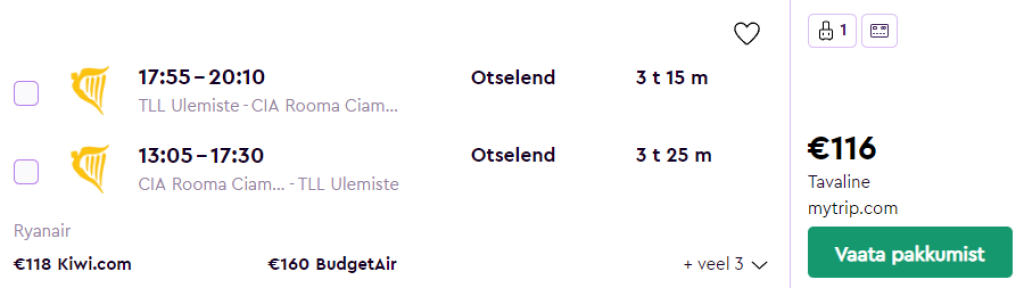 Ryanair pakub hetkel suurepärase hinnaga lennupileteid Itaalia pealinna. Edasi-tagasi lennupiletid otselendudele Tallinnast Rooma Ciampino lennujaama on saadaval alates 116€ eest. Soodsa hinnaga lennukuupäevi leidub vahemikus august - oktoober. Parima hinnaga lennupiletid leiab läbi Momondo.ee