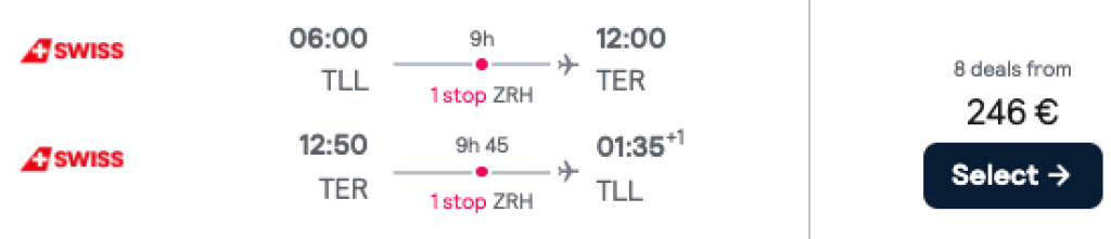 SWISS pakub hetkel suurepärase hinnaga lennupileteid Assooridele. Ühe kiire ümberistumisega lennupiletid Tallinnast Terceira saarele on hetkel saadaval alates 246€ eest.