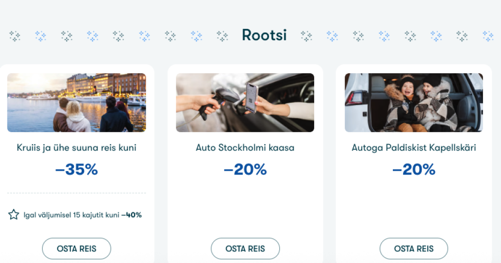 Tallinkil on hetkel käimas kampaania Club One liikmetele, kus pakutakse väga hea hinnaga laevapileteid Stockholmi ning Helsingisse. Soodukas on nii 2 päevastele Stockholmi kruiisidele kui ka päevatrippidele Helsingisse. Samuti on pakkumisel ka laevapiletid Paldiskist Kapellskäri. Pileti soetamisel tuleb lisada sooduskood ning soodustus rakendub piletitele automaatselt.
