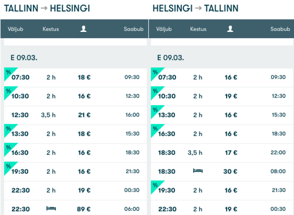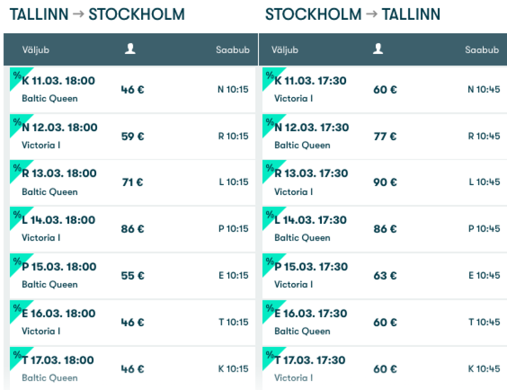 Vahelduseks ka üks soodne kampaanialeid laevafirmadelt. Nimelt pakub Tallink hetkel soodsa hinnaga laevapileteid Tallinnast Helsingisse ja Stockholmi. Kui sul on Club One kaart, siis saad pakkumise veelgi soodsamalt. Pakkumine kehtib väljumistele vahemikus november-märtsi lõpp. Soodustused kehtivad ka auto transpordiks.