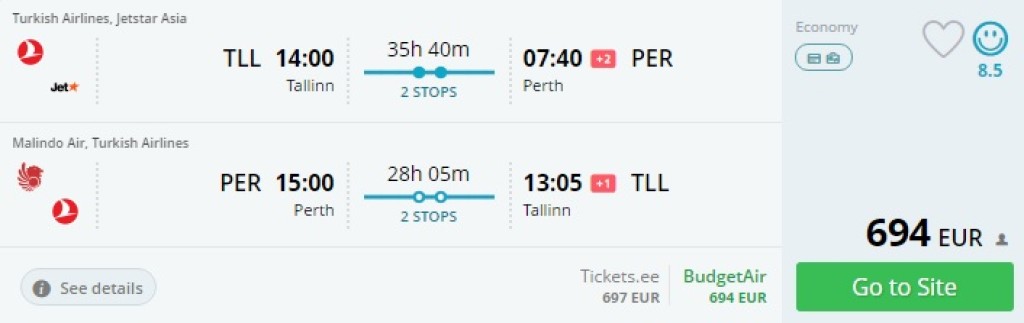 Endiselt on 2017. aasta algul saadaval piletid Tallinnast Austraaliasse Perthi, sedapuhku hinnaga 694€. Lennud Toimuvad Turkish Airlinesi ja Malindo Airi ning Jetsatar Asia koostöös.